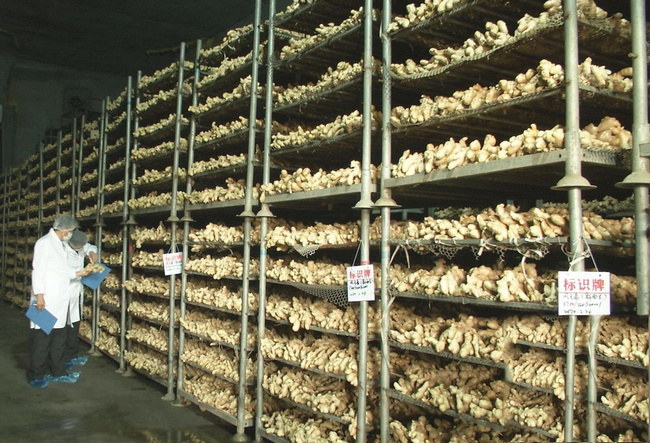 2. 貯藏前處理:冷藏的生姜存放在通風良好、恒溫均勻的架子上。收獲初期的生姜脆、嫩、易剝皮。入庫后的貯存溫度宜控制在15~17℃左右;如果“圓頭”的儲存溫度低于15~17℃,可利用蓄冷風機進行加熱,以保持溫度恒定。30-40天后降至13℃-14℃。